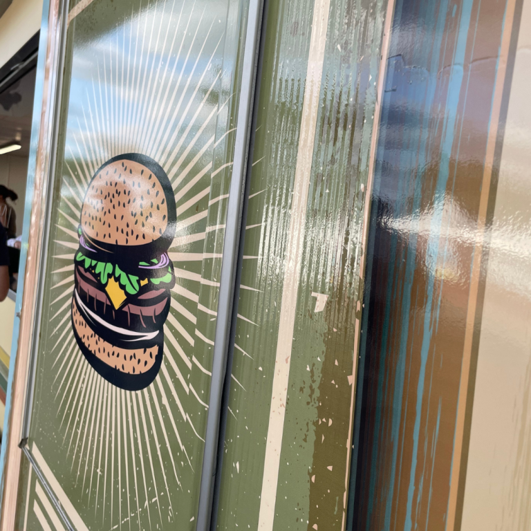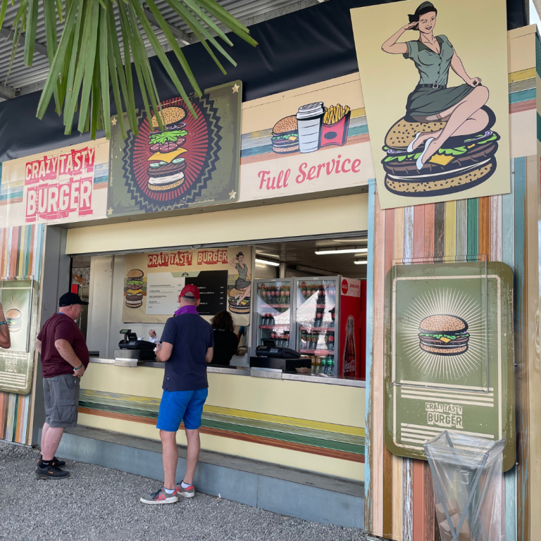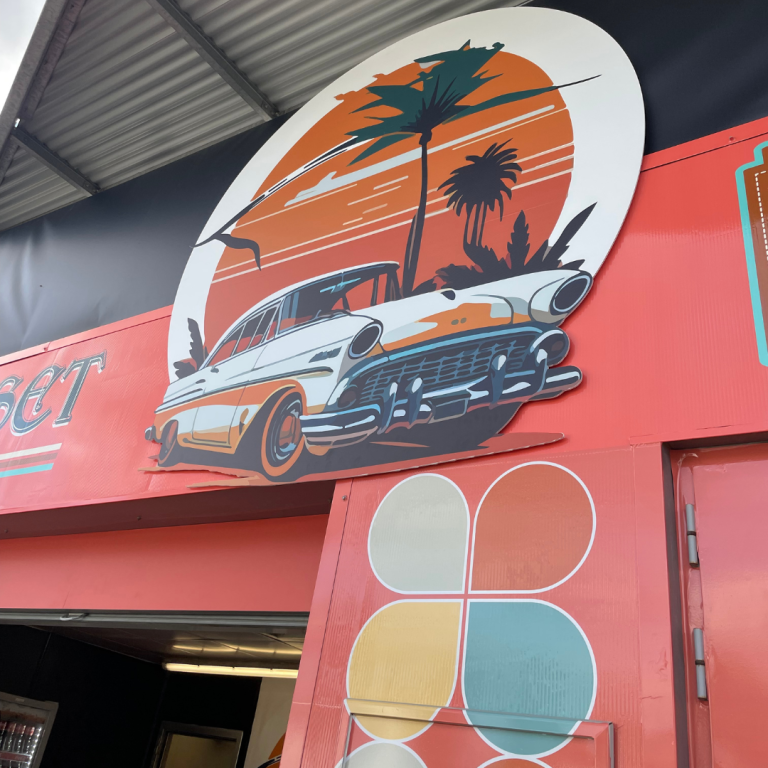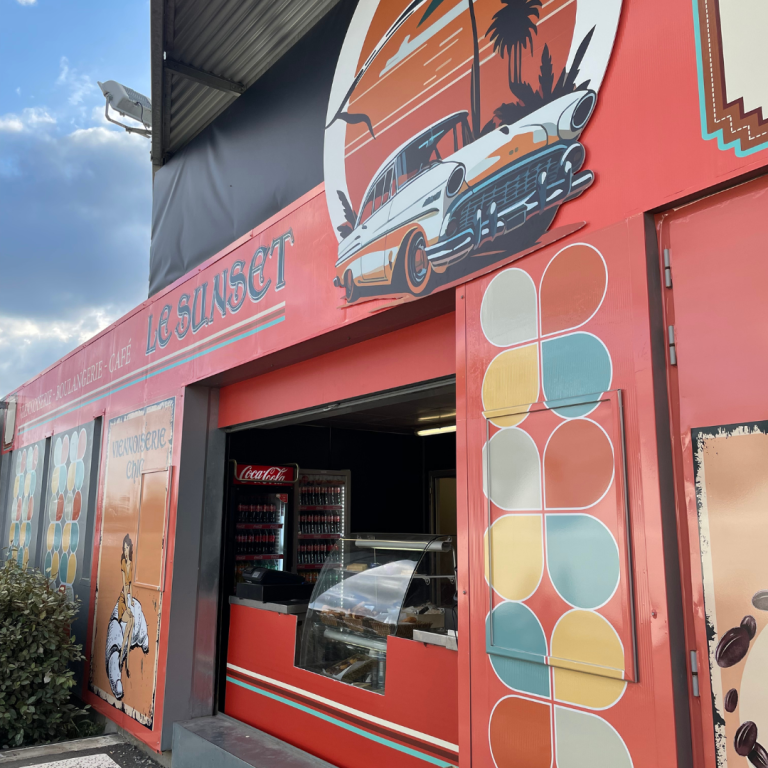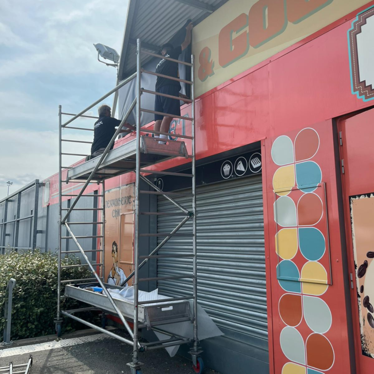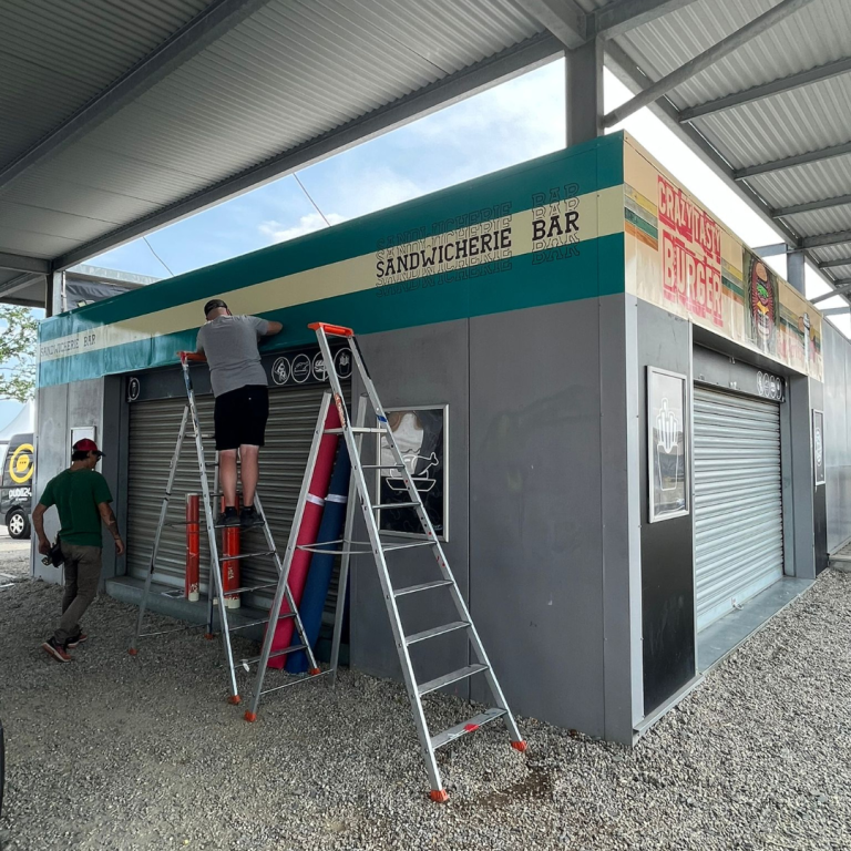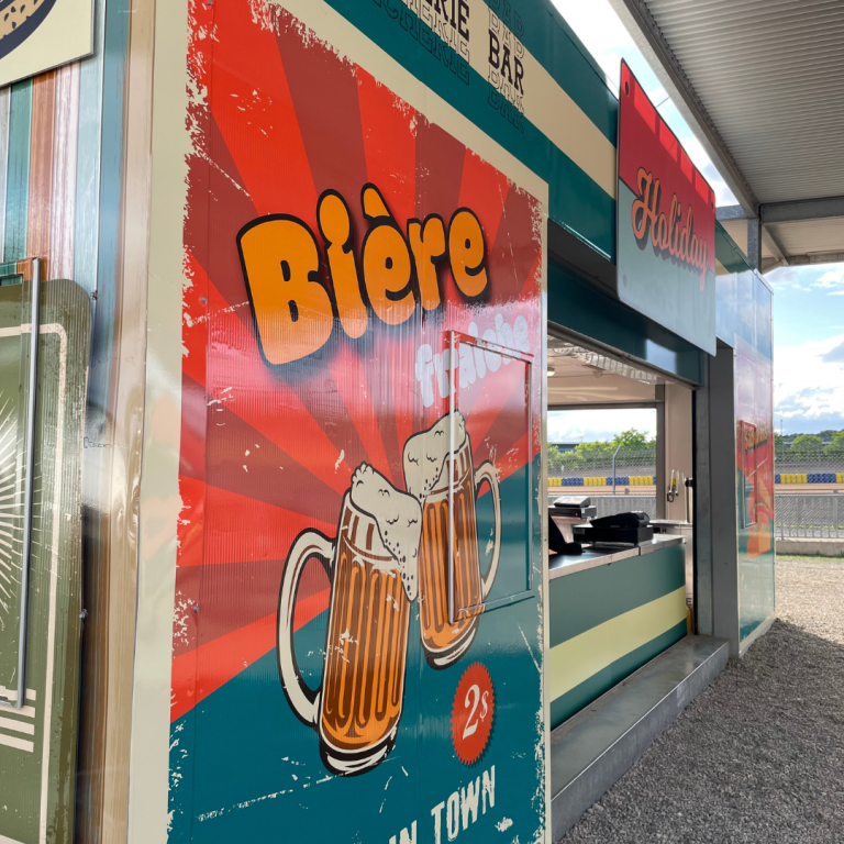 Le restaurant La Courbe était présent au Village du Circuit des 24 heures du Mans à l’occasion du Mans Classic. Nous avons habillé l’ensemble de sa devanture et de sa façade avec des adhésifs imprimés et des panneaux imprimés personnalisés.