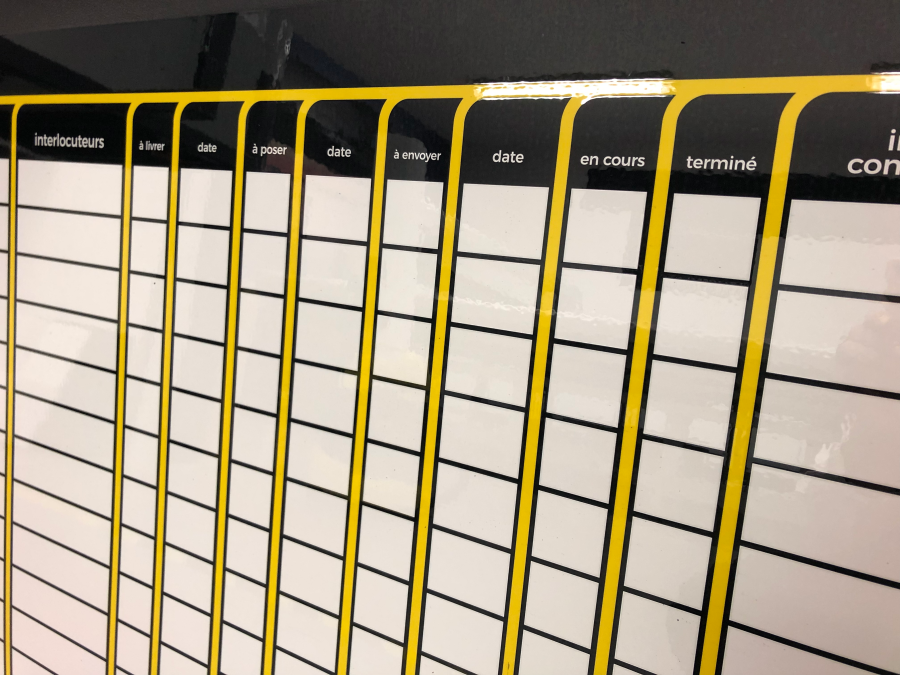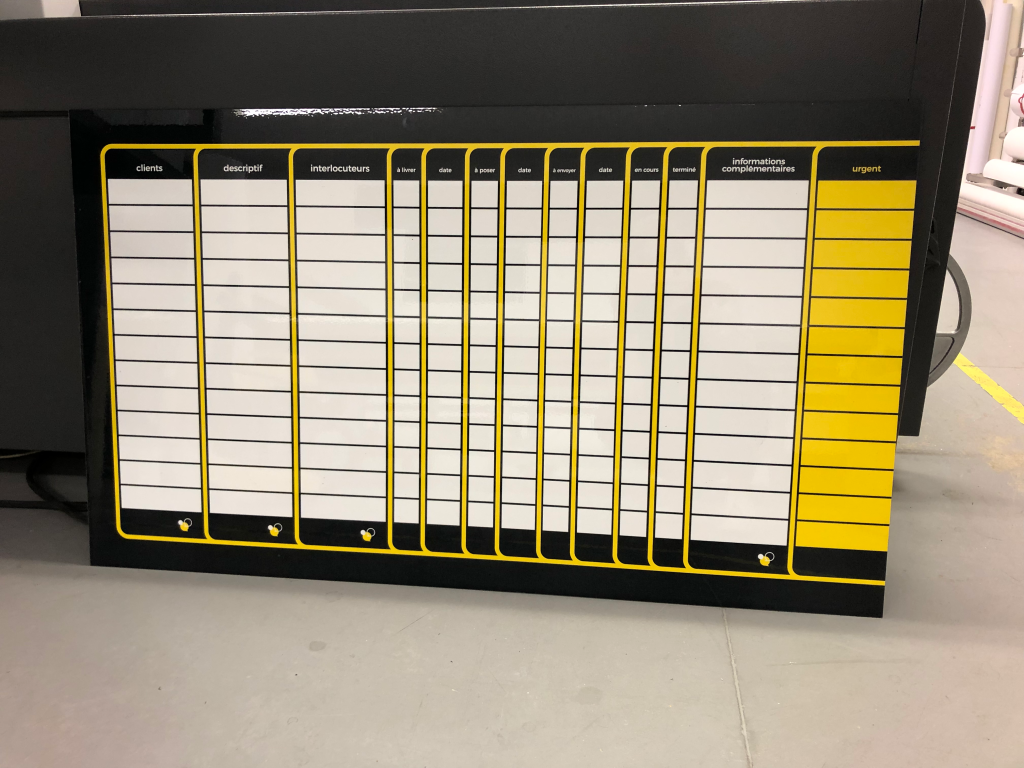 Transformez vos tableaux Velleda avec notre impression numérique sur films spéciaux, conçue pour créer des surfaces personnalisées et durables. Idéals pour le lean management, nos tableaux peuvent être blancs ou magnétiques, et adaptés à vos besoins spécifiques.