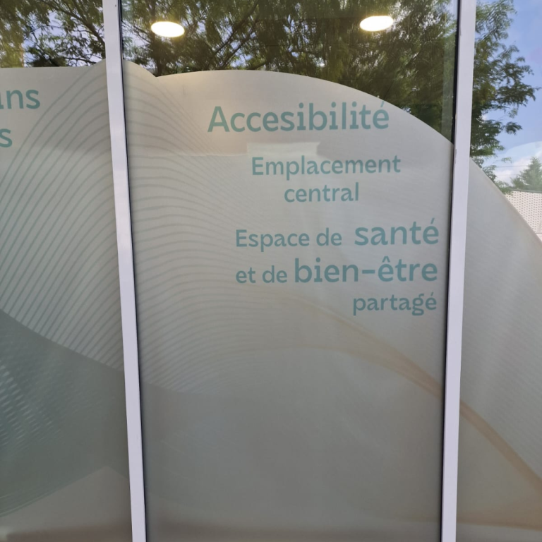À l'intérieur, nous avons créé et installé des films incolores avec une impression numérique imitation dépoli avec un blanc de soutien.