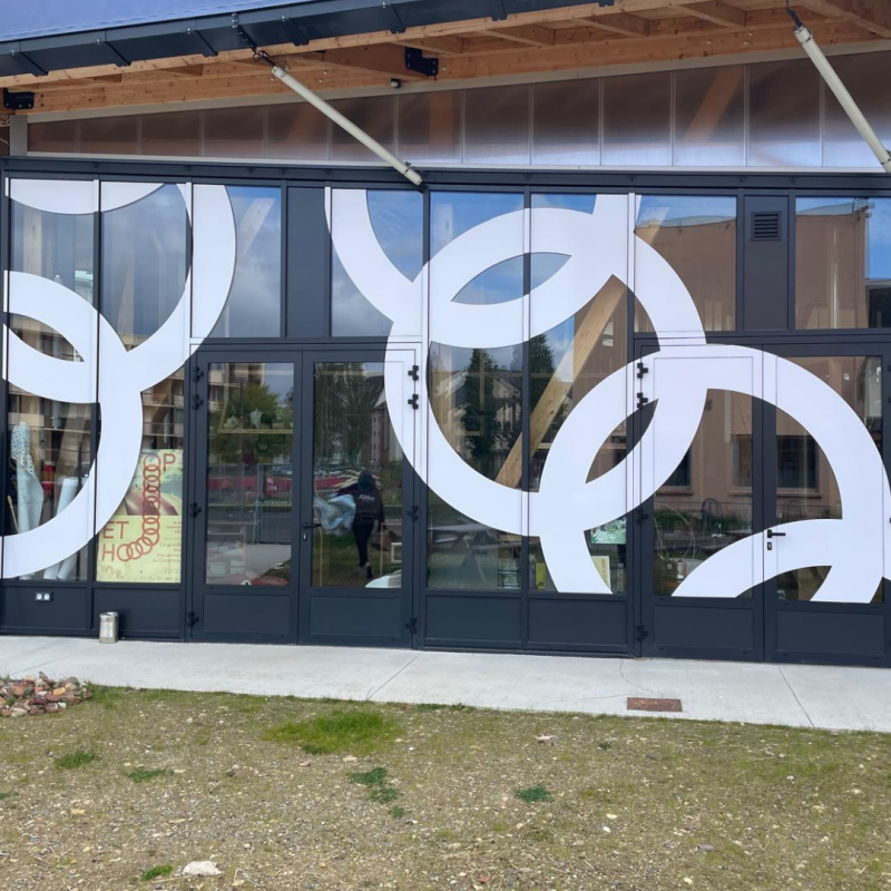 Cette vitrophanie fait partie intégrante de la signalétique extérieure du site, mêlant création artistique et communication visuelle.